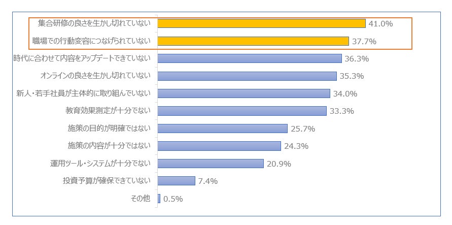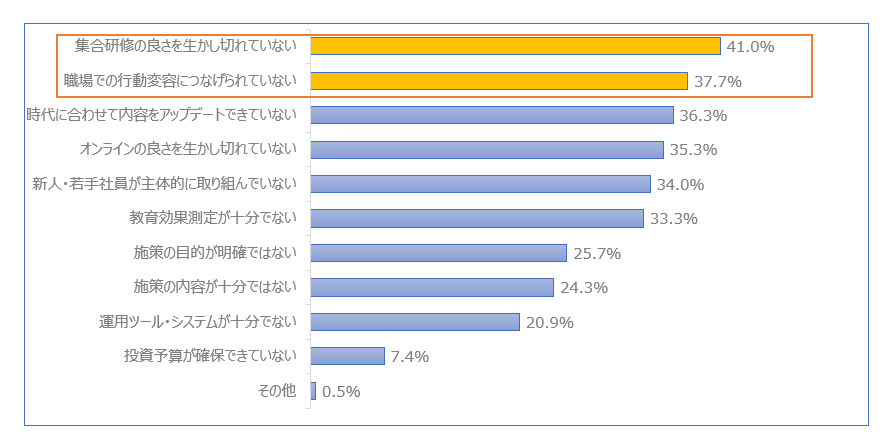 Off-JTに課題があるか聞いたところ、約85%が「課題がある」と考えていることがわかりました<「部分的に課題がある」(58.7%)「全体的に課題がある」(26.0%)>。具体的な課題として挙がったのは、「集合研修の良さを生かし切れていない」(41.0%)。特にコロナ禍でオンライン研修の機会が増えたため、「集合研修ならではの体験価値を増やしたい」と考える人が多いことが予想されます。次に挙げられたのは、「職場での行動変容につなげられていない」(37.7%)。これは従来から定番の課題ですが、昨今の環境変化を踏まえ、「働き方の変化に適応した職場での行動変容とは何か」ということをまずは再考する必要があるでしょう。