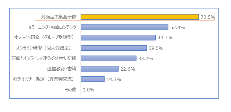 「新人・若手社員にOff-JTを行っていますか」という質問では、新入社員に対して54.4%、2年目社員に対して52.0%、3年目社員に対しては45.0%の企業が、「Off-JTを行っている」と回答しました。具体的には「対面型の集合研修」(70.5%)を行っているという回答がもっとも多く、コロナ禍で一時的に減っていたこのスタイルが復活していることがわかります。一方、「対面とオンラインを組み合わせた研修」(33.2%)も3割強が行っていると回答。ハイブリッド型研修の存在感が高まっています。