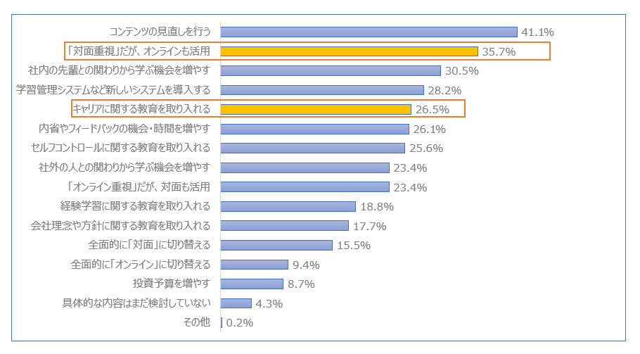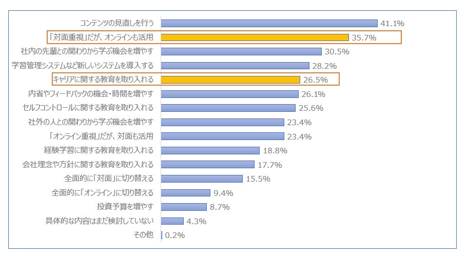 Off-JTの課題に関して、「改善策を検討しているか」という質問には、9割超が「見直しを検討している」と回答しました。具体的な改善策を聞いてみると、1位に挙がったのは「コンテンツの見直しを行う」(41.1%)、次いで「『対面重視』だが、オンラインも活用」(35.7%)。これは、「全面的に『対面』に切り替える」「全面的に『オンライン』に切り替える」よりも高い結果となり、あらゆる学習形態を組み合わせながら、学び方や学ばせ方を効果的に変化させていくことが求められているといえます。また、「キャリアに関する教育を取り入れる」(26.5%)も上位に挙がったことから、自律的なキャリア形成を促したいという人事担当者の意図も見える結果となりました。
