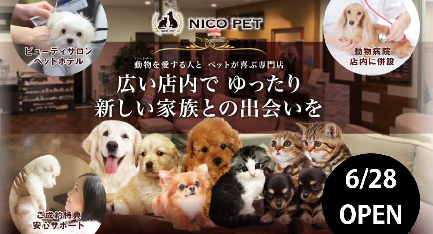 NICO PETは「人と動物が共に幸せに生きる社会の実現」をコンセプトに、飼い主とペットの幸せを最大化するサービスをお届けする総合ペット専門店です。「ペットを迎える」から「ペットを育てる」までのあらゆるペットライフのお手伝いをすべく、トリミング施設・ペットホテル・動物病院など充実したサービスを提供します。
