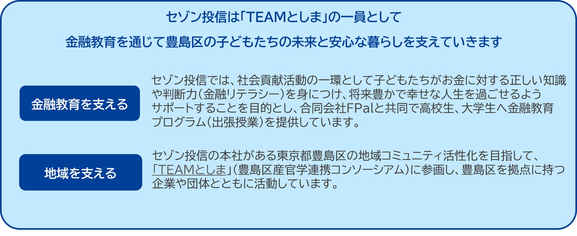 本イベントは、豊島区が推進する地域区民ひろば構想モデル事業「子どもがいきいき過ごせるひろば」の一環として開催されるもので、セゾン投信は地域連携プロジェクト「TEAMとしま」の一員として、金融ジャンルに強い“区民ひろば”の特色づくりに貢献しています。