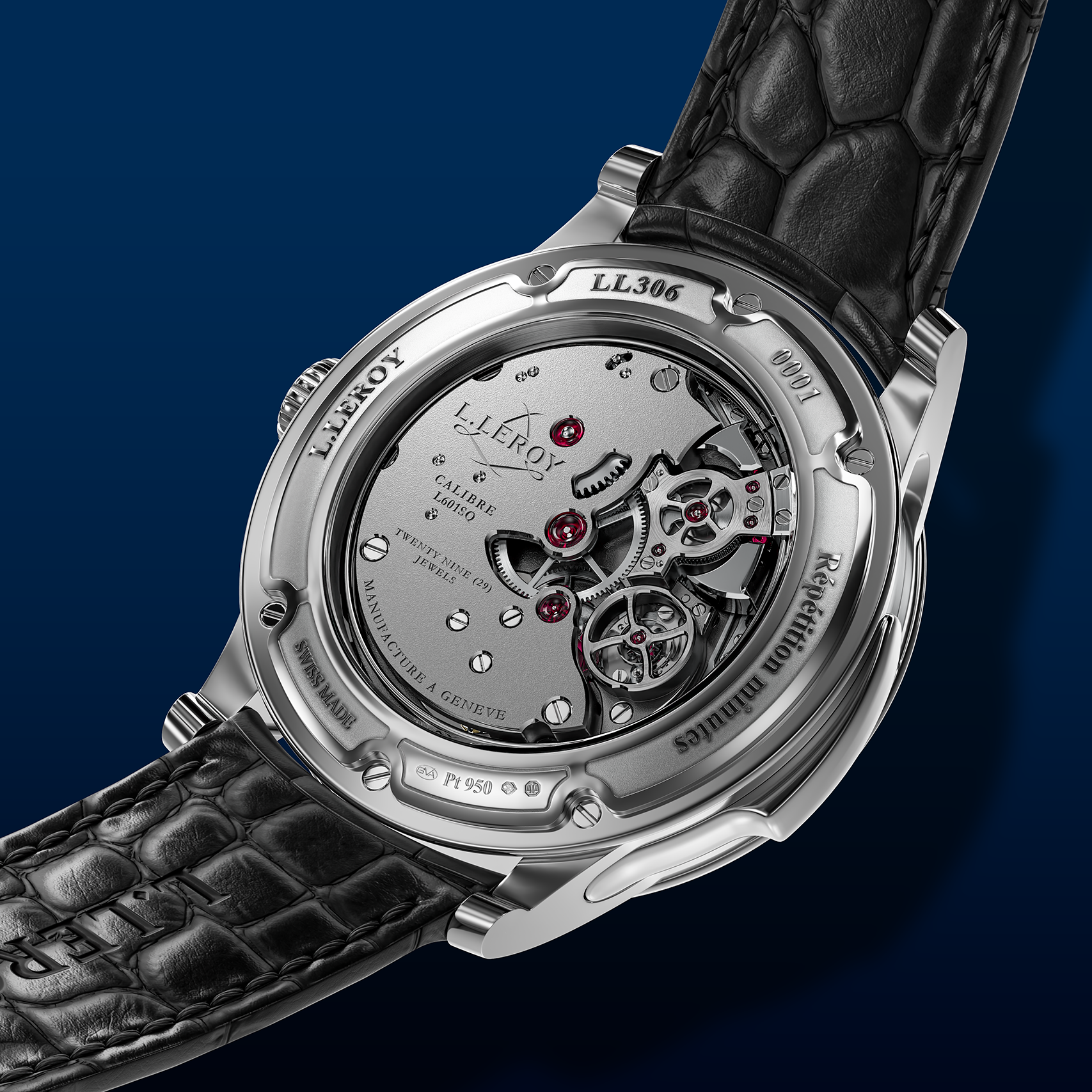 ・ロジウムメッキのシルバーアワートラック(サンレイ仕上げ)、ブラックデカールのL.Leroyアラビア数字、ALD処理ブルーの時針