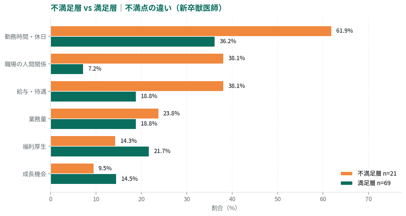 満足層ではわずか7.2%しか「職場の人間関係」への不満を感じていないのに対し、不満足層では38.1%と約5倍(+30.9pt)の開きがあります。勤務時間や給与への不満は満足層にも一定程度存在しますが、人間関係の問題は不満足層固有の課題として突出しており、新卒獣医師の定着を左右する最大の分水嶺となっています。