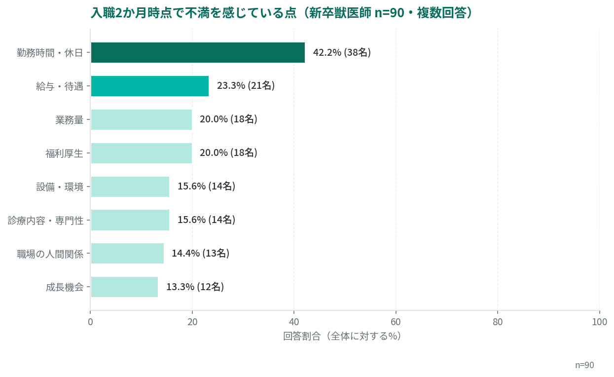 就職してわずか2か月時点での不満点の第1位は「勤務時間・休日」42.2%で、給与(23.3%)・業務量(20.0%)を大きく上回りました。新卒獣医師にとっては、長時間労働や休日の少なさが、入職直後から顕在化する最大の懸念となっています。