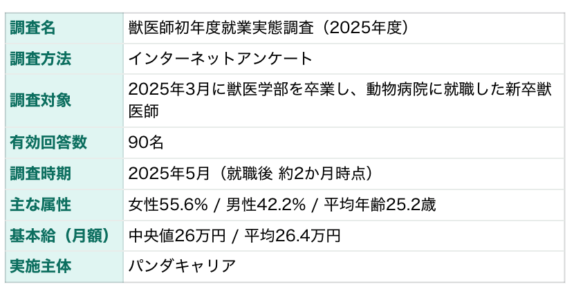 A'alda Japan株式会社の子会社である、A’alda Y株式会社(本社:東京都品川区、代表取締役社長:大沼 篤、以下 A'alda)は、獣医師・動物看護師・トリマーに特化した人材紹介サービス「パンダキャリア」にて、動物病院の採用活動のご支援にあたり、新卒獣医師の就職活動の方法・職場選びの意向・入職直後のリアルな本音を明らかにするため、2025年3月に獣医学部を卒業し動物病院等に就職した新卒獣医師90名を対象に、就職後約2か月時点(2025年5月)で「獣医師初年度就業実態調査」を実施いたしました。