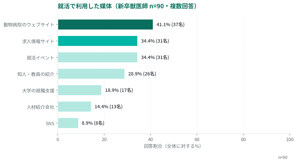 就職活動で利用した媒体は「動物病院のウェブサイト」41.1%、「求人情報サイト」34.4%、「就活イベント」34.4%、「知人・教員の紹介」28.9%。自院ウェブサイトが最重要チャネルであり、採用ページの写真・スタッフの声・教育体制の充実が、応募数を直接左右します。