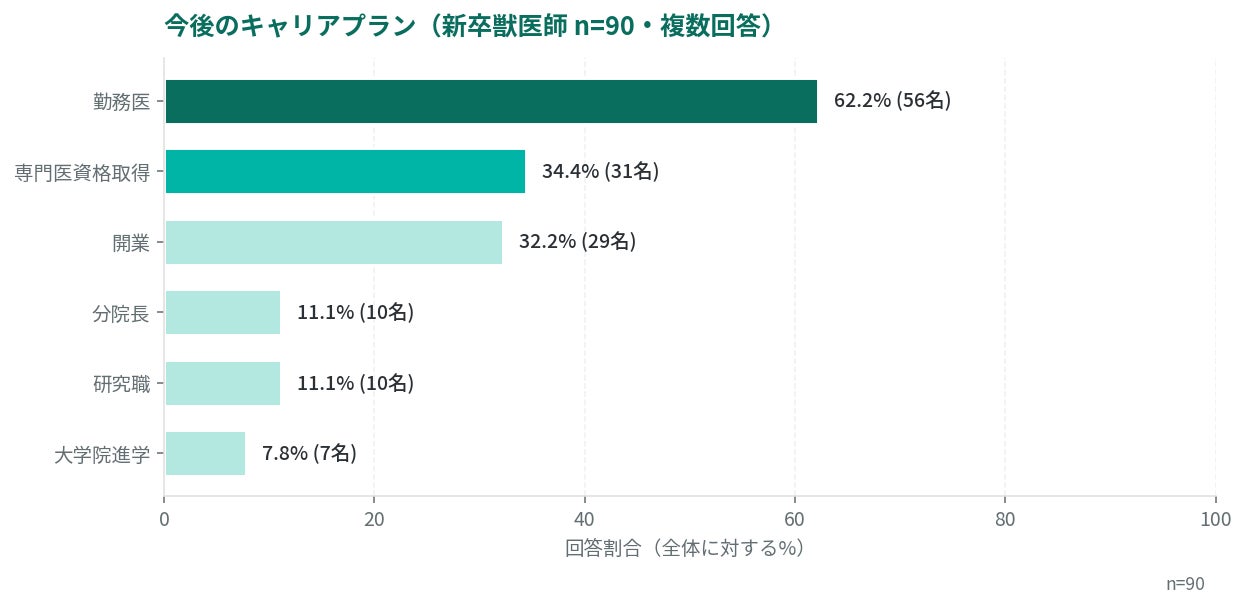 今後のキャリアプランは「勤務医」62.2%が最多で、続いて「専門医資格取得」34.4%、「開業」32.2%。新卒獣医師は3~5年で次のステップを意識する傾向が強く、3年目・5年目のキャリア提示や専門医取得支援制度を持つ病院が選ばれ続けます。