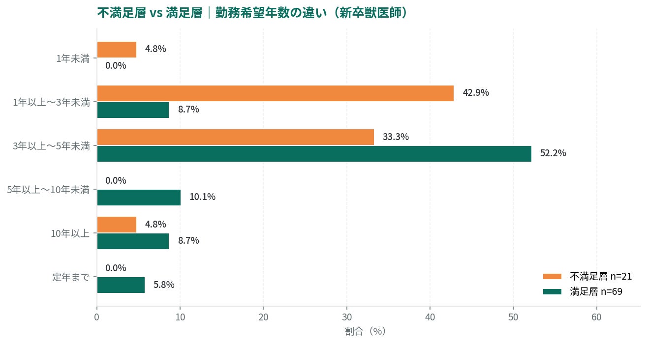 💡 採用ご担当者へのインサイト 入職2か月時点で、不満足層の約半数が既に3年以内の離職を視野に入れているという事実は、動物病院の採用・定着戦略にとって極めて重要な問題です。1on1面談・メンタリング・定期的な匿名アンケートなど、不満を早期にキャッチする仕組みが、初年度離職防止のカギとなります。