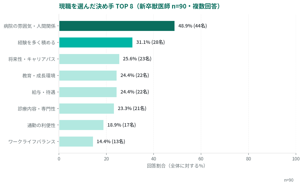 現職を選んだ決め手の第1位は「病院の雰囲気・人間関係」48.9%。第2位「経験を多く積める」31.1%、第3位「将来性・キャリアパス」25.6%。新卒獣医師は「誰と働くか」「どう成長できるか」を最重視しています。