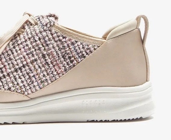 1.「ラメブラウン」は、ミルクティーのようなやわらかな色味に、シャリ感と落ち着いた光沢がある、秋冬にピ ッタリの上品なブラウンです。「ベージュ×ピンク」は、ピンクを基調にしたツイード調の生地に仕上げました。ファンシーヤーンの彩りと風合いがコーディネートに取り入れやすく、ベージュの靴紐やつま先、踵のパーツがやさしい雰囲気を演出します。