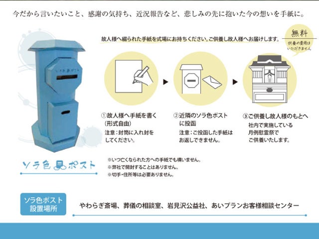 亡くなった方への気持ちを綴ったお手紙を、ご供養してお届けします 『ソラ色ポスト』をやわらぎ斎場などに設置
