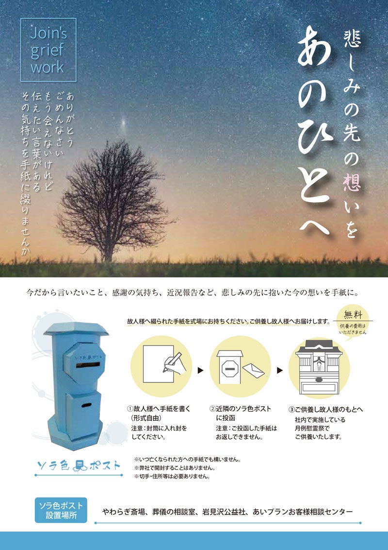 株式会社あいプラン(北海道札幌市/代表取締役 新道喜信)が経営するやわらぎ斎場を含む店舗に、グリーフケアの一環として故人様へのお気持ちをお届けする「ソラ色ポスト」を設置いたします。伝えたい言葉を手紙にして「ソラ色ポスト」にご投函ください。やわらぎ斎場にて大切にお預かりしてご供養いたします。