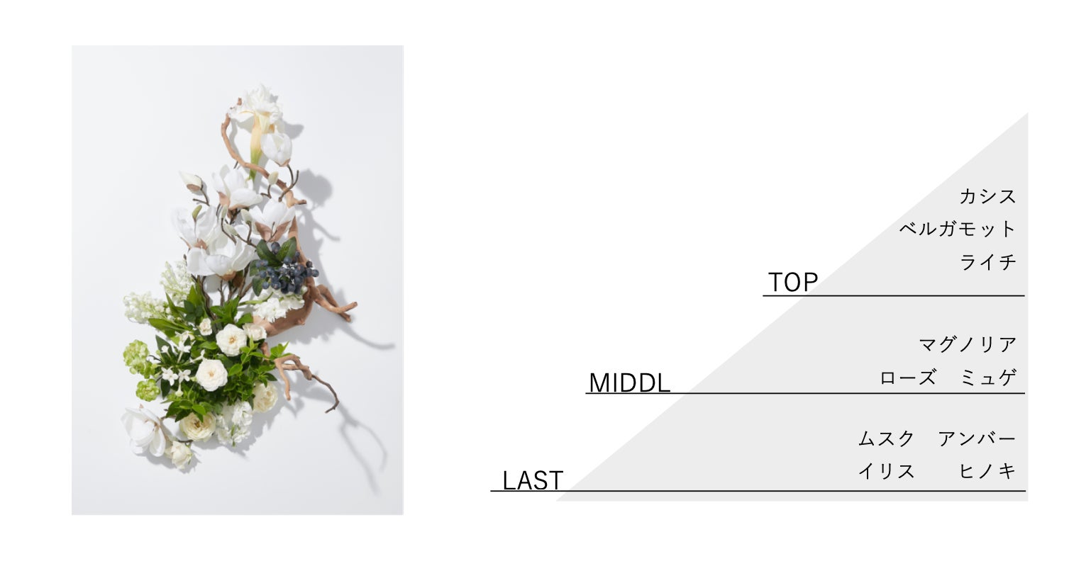繊細なマグノリア、ローズ、ミュゲのフローラルブーケを深みのあるムスク、アンバー、イリス、カシミアウッドが包み込む上品な香り。透明感のあるカシス、ベルガモット、ライチをトップノートのアクセントに加えて、心地よくやさしい印象に仕上げました。