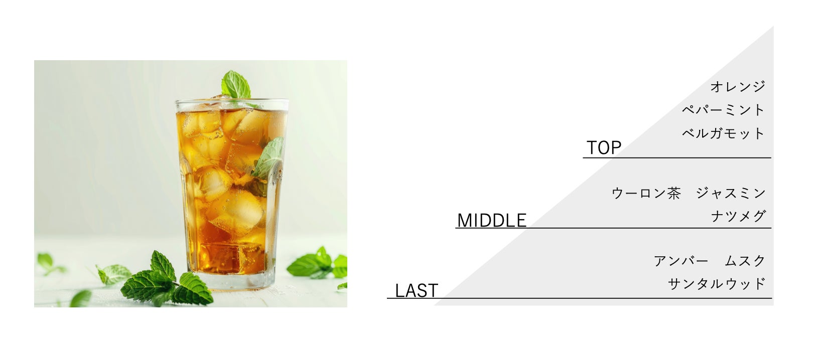 フレッシュなベルガモットやオレンジなどのシトラスに清涼感のあるペパーミントを合わせた爽快感のある香り。アクセントにウーロン茶のほのかな渋みとナツメグのスパイシーさを加え、やわらかなムスクを調和させることで、上品で落ち着きのある香りに仕上げました。