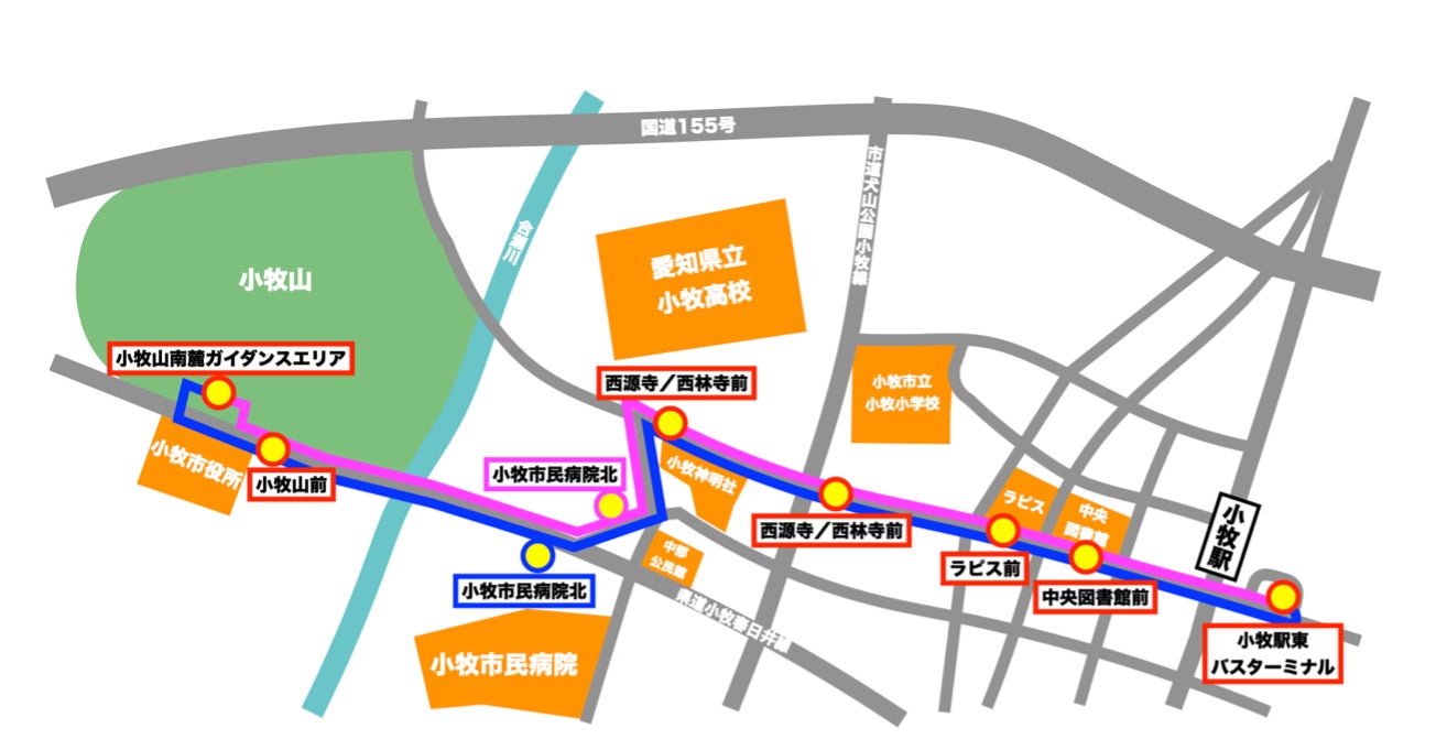 本実証調査では、名古屋鉄道小牧線の小牧駅から、織田信長が小牧山城を築城したことでも知られ国の史跡にも指定されている小牧山までの愛知県道を含むルート(⽚道1.8km)を、⾃動運転車両が、⾃動運転レベル 2で⾛⾏します(平⽇:往復7便、土日祝日:往復8便)。運行ルートの一部は、名鉄バス株式会社およびあおい交通株式会社がそれぞれ運行する路線バスのルートと重なっており、自動運転車両の乗降場のうち6カ所は、名鉄バス株式会社、あおい交通株式会社および愛知県西春日井郡豊⼭町※2の協⼒の下、路線バスの停留所に併設します。自動運転車両の乗降場と路線バスの停留所を併設する場所では、発車する際に路線バスを優先するなど、路線バスの運行事業者と連携してスムーズで安全に運行できるようにします。