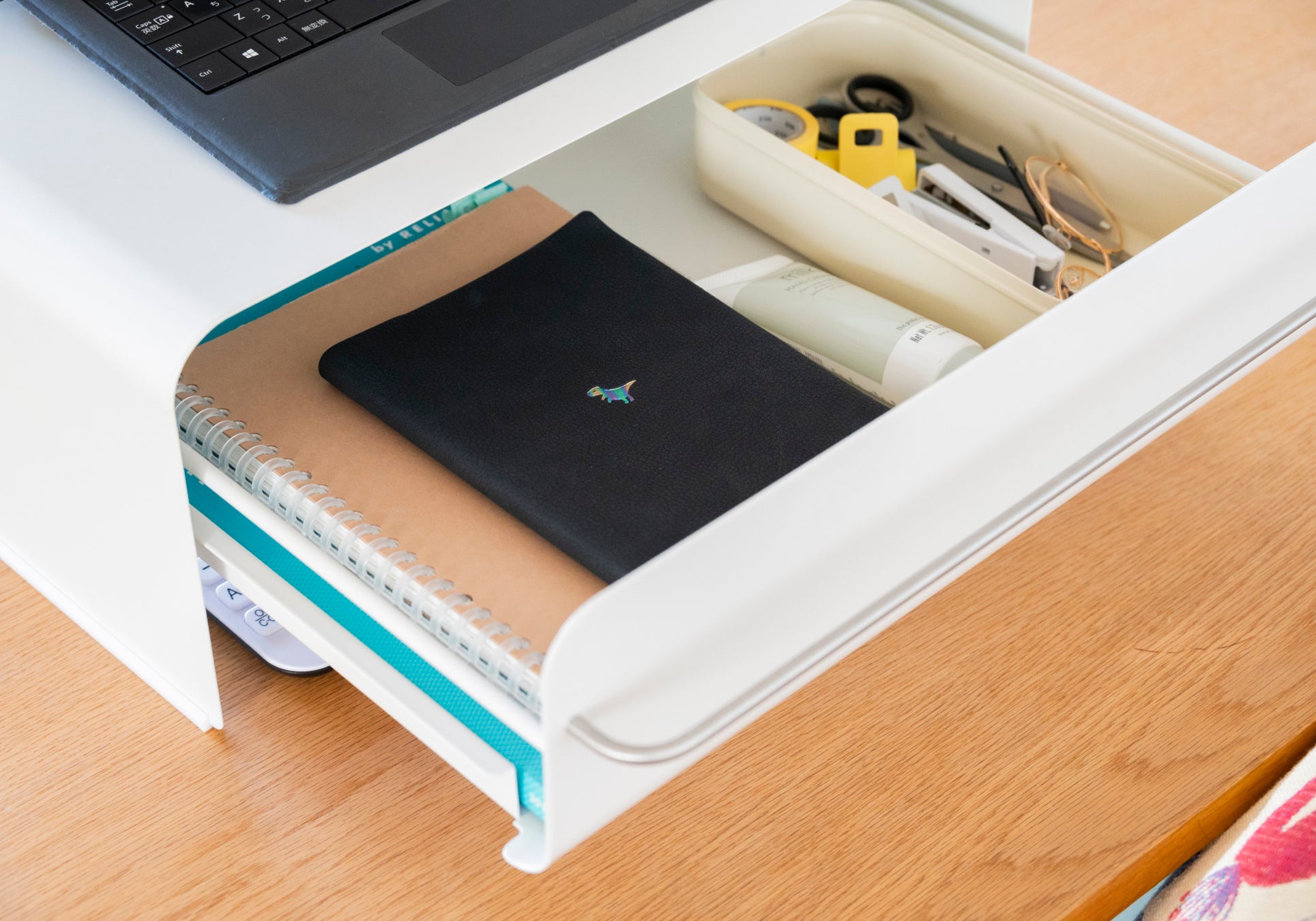 さらに、デスク周りの収納にも活躍。ノートパソコンを天板に置いて使用すれば、手軽に引き出し収納を増やせます。使用頻度の高いステーショナリー類やA4書類・封書をまとめて整理でき、ワークスペースをすっきり保ちながら作業効率もアップ。キッチンからデスクまで幅広く使える、頼れる収納アイテムです。