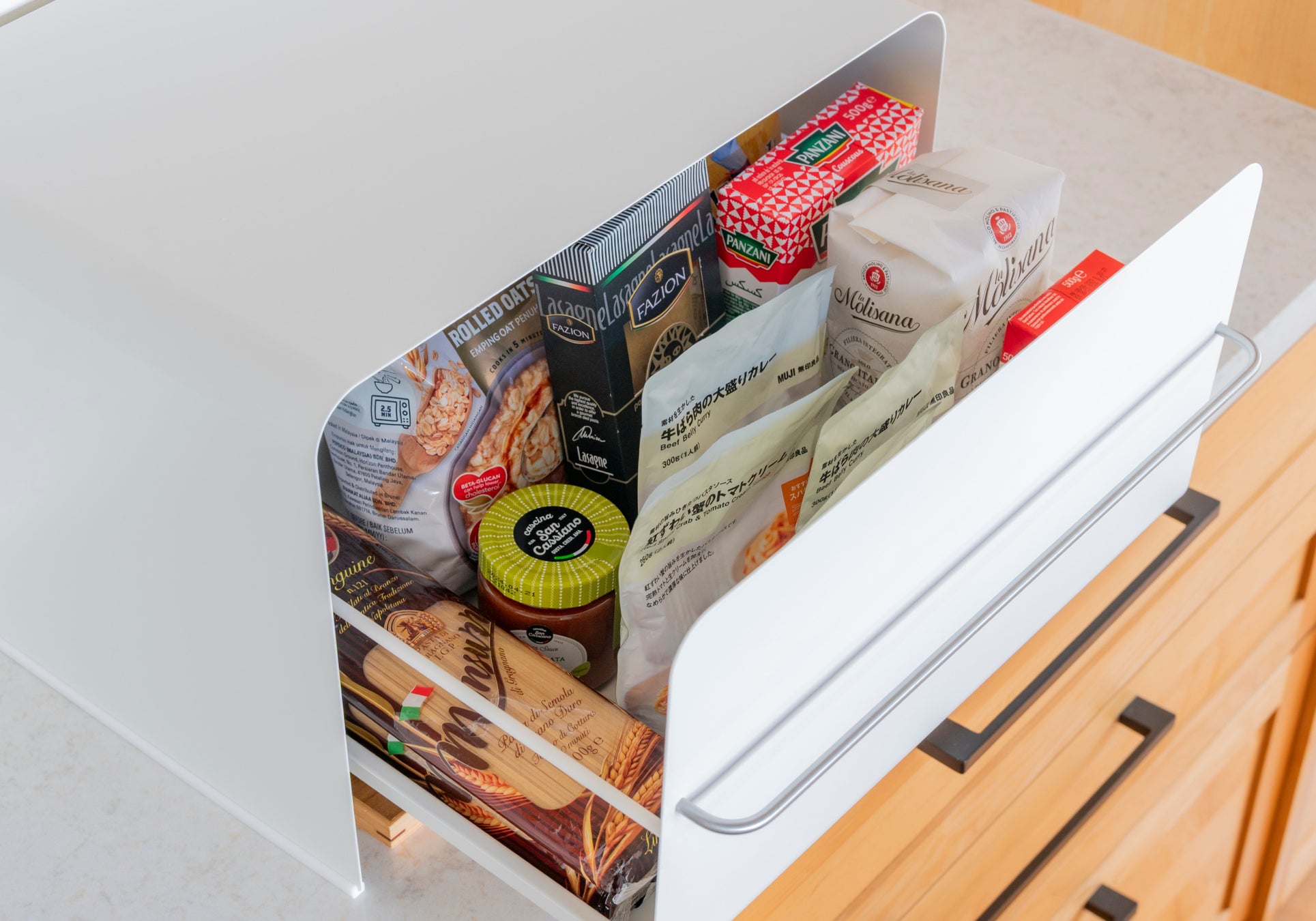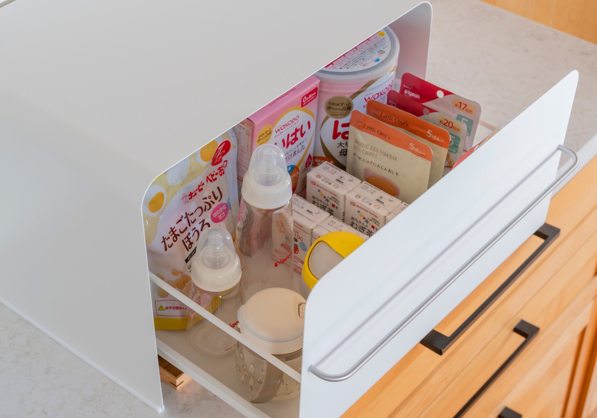 大きめのシリアルやグラノーラ、レトルト食品や離乳食セットなどのストックもまとめて収納でき、キッチンまわりをすっきり整えます。