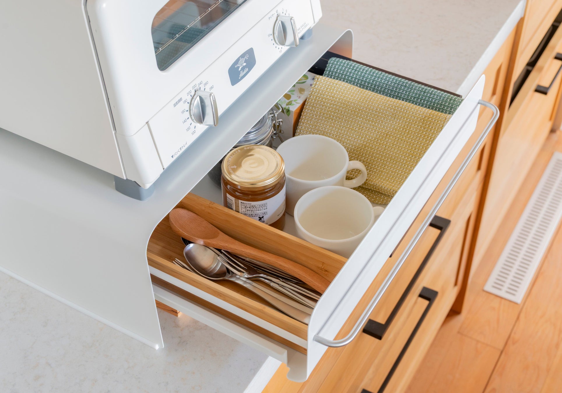 既存モデル同様、フラットな天板は耐荷重5kgでトースターやケトルの置き場所に最適。上部を有効に活用できることで、限られたキッチンスペースも広々と使えるのが魅力です。