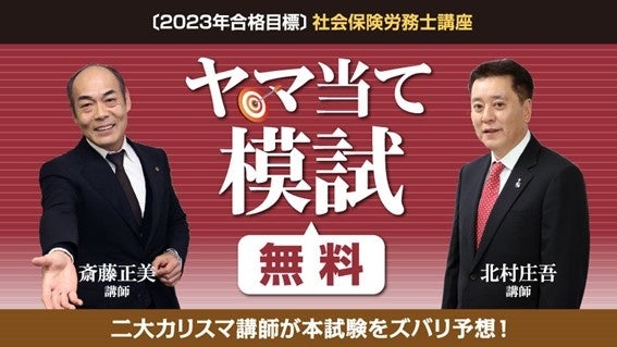 「ヤマ当て模試」は、社労士受験界きってのカリスマ講師である『北村庄吾講師』『斎藤正美講師』がプロデュースする本試験の予想模試です。解説動画や成績表のダウンロードサービスまでついて、利用料はすべて無料。すべての社労士受験生を応援する恒例企画として、毎年多くの方にご利用いただいています。
