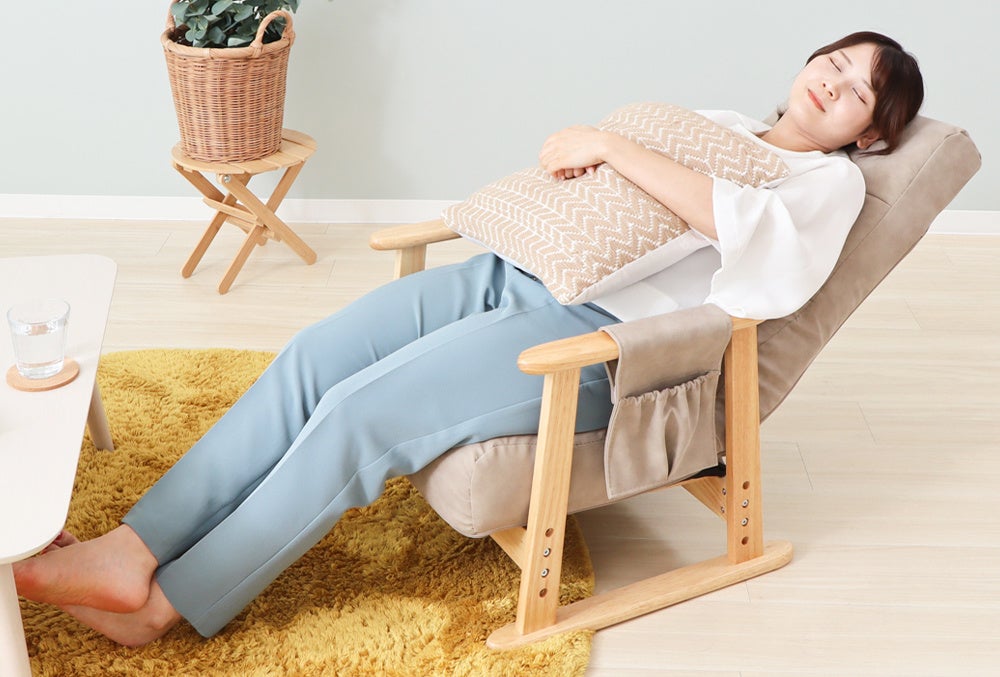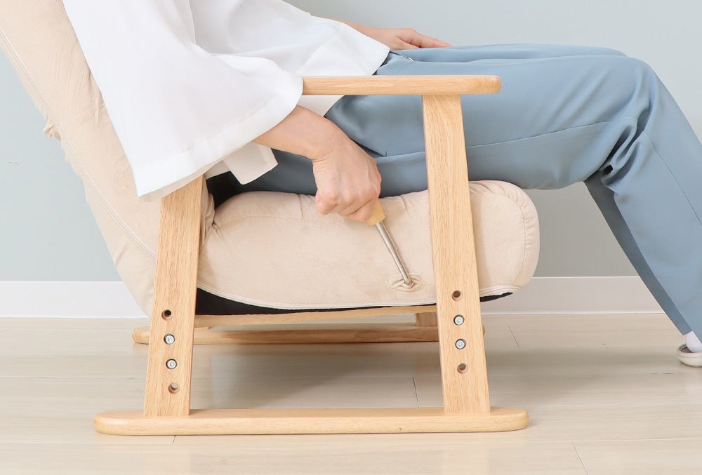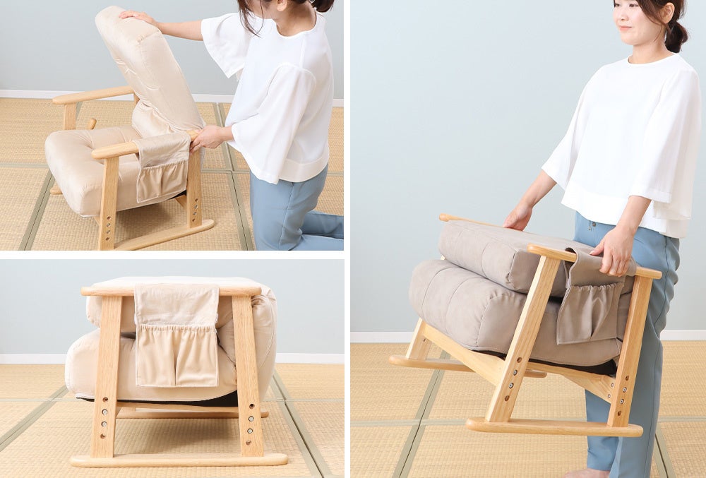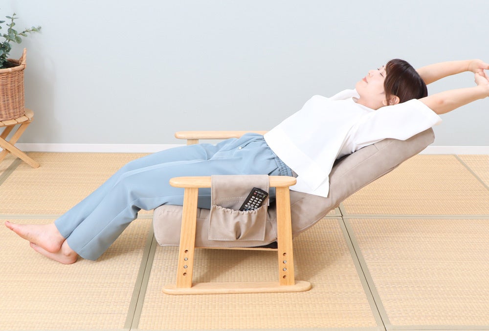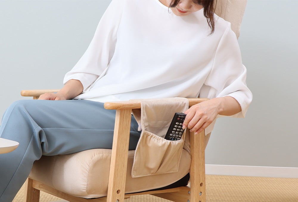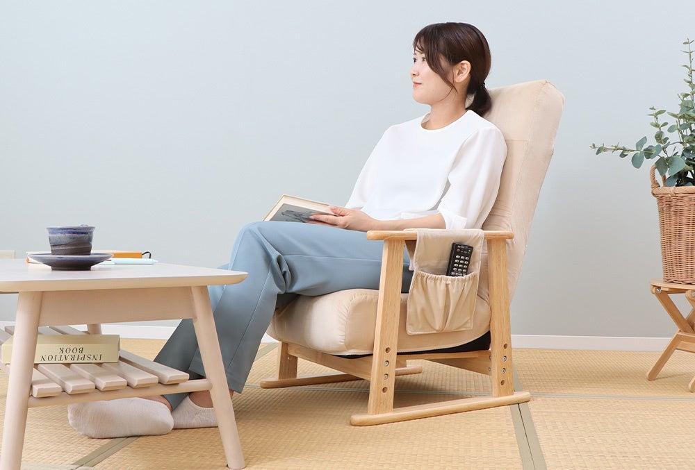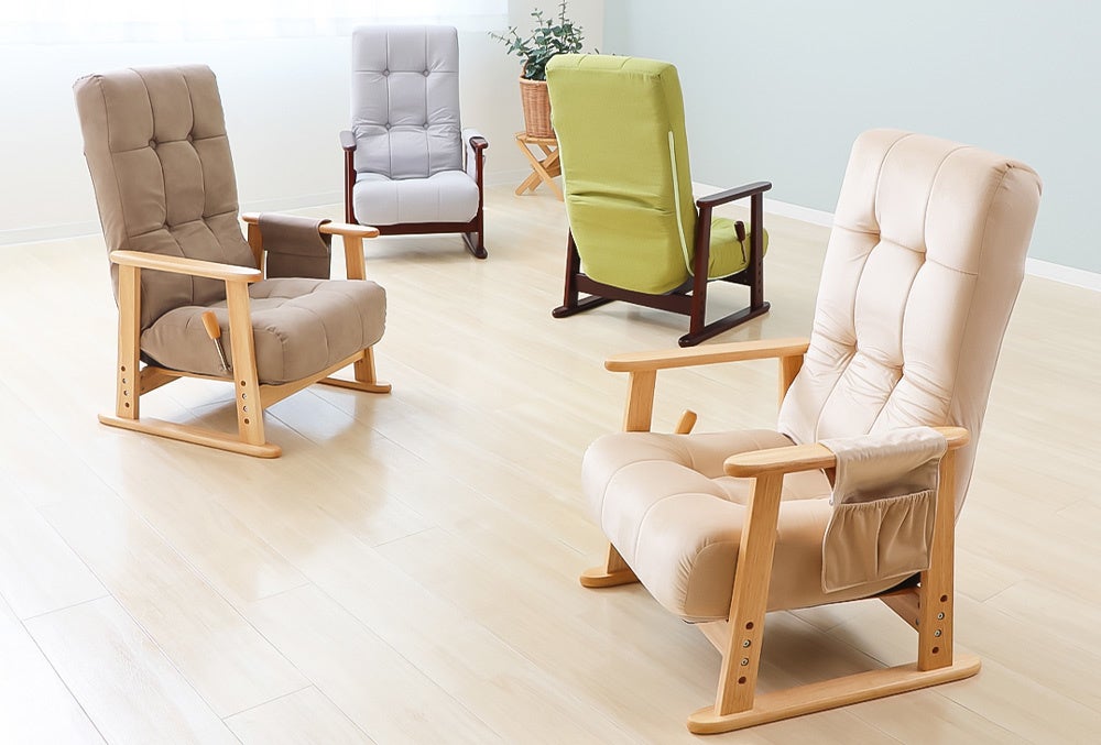 床との接地面積が広く安定感のあるソリ脚を採用し、握りやすいひじ掛けが、膝や腰に不安のある方の立ち座りをサポートします。主張しすぎない和洋折衷のデザインが洋室にも和室にもすっと馴染み、コンパクトなサイズ感は”ご夫婦で2台並べて”といった使い方も!場所をとらないことも嬉しい。完成品なので「届いてすぐに使える」ことがギフトに人気の理由です。
