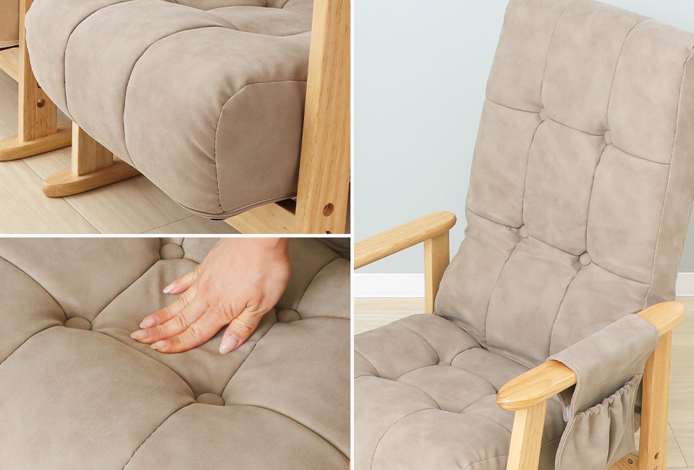 座面の厚みは約13.5cmとボリューム満点。表面はやわらかいのに底付き感のないしっかりとしたクッションシートは体が沈み込み過ぎることなく、立ち座りを楽にします。シートのデザインとなっている”くるみボタン”で作られた凹凸は「体の熱がこもりにくく蒸れにくい」「体が滑りにくい」といった効果があり、長時間座っていても快適なシートです。