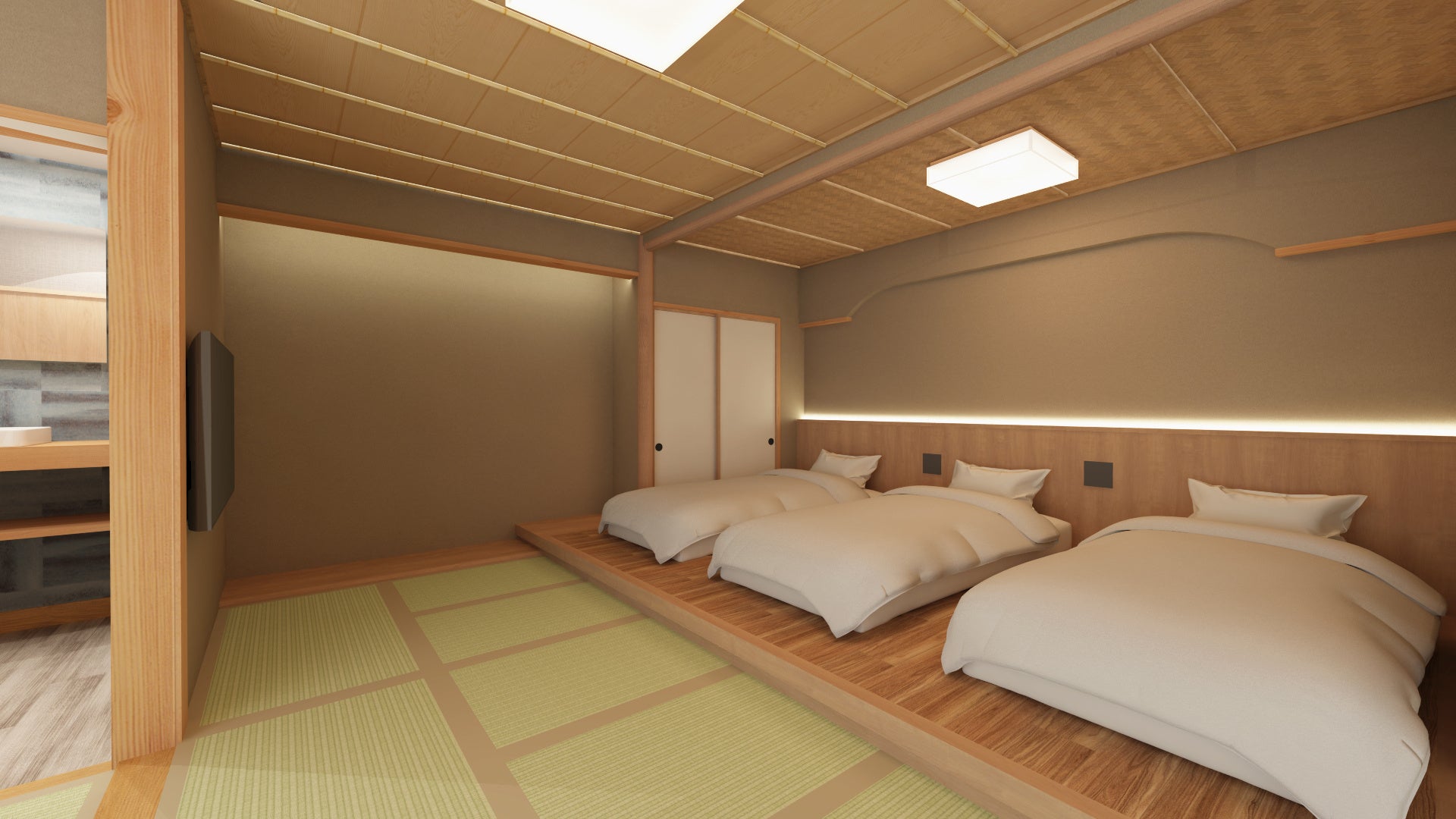 2.和の趣を活かした快適な客室へ 全室の壁紙を刷新し、落ち着きのある和モダンな空間に。さらに、小上がりを設置しマットレスを採用することで、従来の和の趣を残しながら、寝心地の良さを追求いたしました。