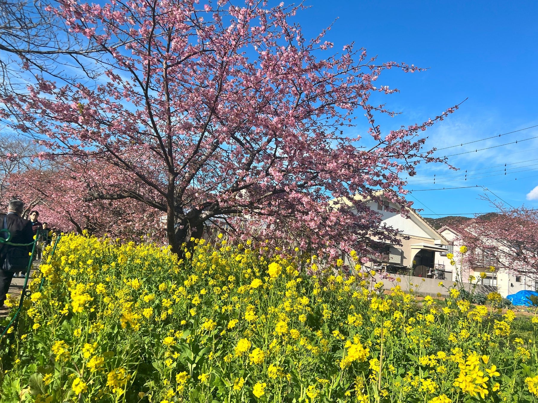 約8kmにわたって咲き誇る河津桜の並木道まで、当館から徒歩約1分。