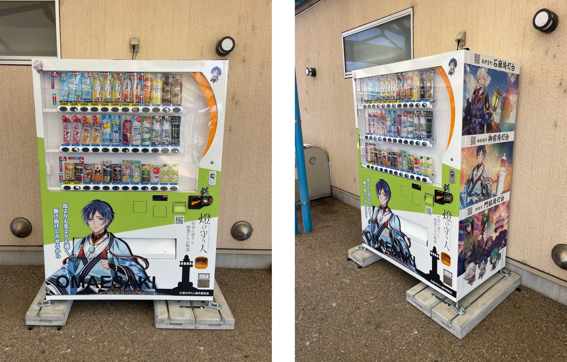 この自動販売機は、燈の守り人のキャラクター活用権を有する御前崎市の地域活性化を目的としており、御前埼灯台(静岡県御前崎市)をメインに、石廊埼灯台(静岡県南伊豆町)と門脇埼灯台(静岡県伊東市)のキャラクターラッピングが施されています。御前崎市を訪れる方々に地域の灯台の魅力を伝え、地域活性化に貢献してまいります。