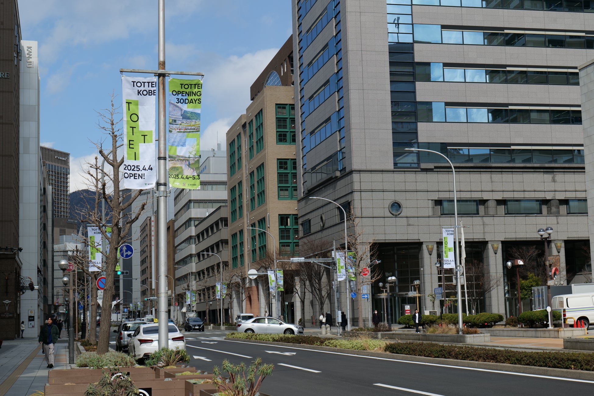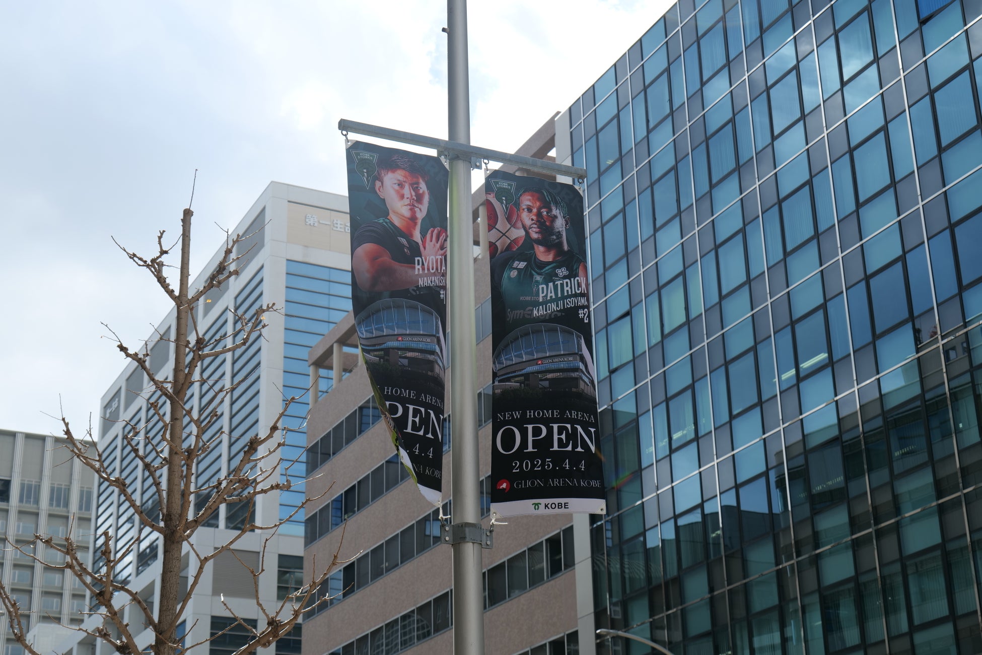 主要ターミナル三宮駅からGLION ARENA KOBEまでのおすすめルートである京町筋(神戸旧居留地・神戸市立博物館前エリア)にてフラッグバナーの掲示を開始しました。<進行方向三宮から海側方向>は各選手のバナーを掲示、<進行方向アリーナから山側方向>にはTOTTEI こけら落とし月間(4月4日~5月3日)のデザインでアリーナまでの道を彩ります。