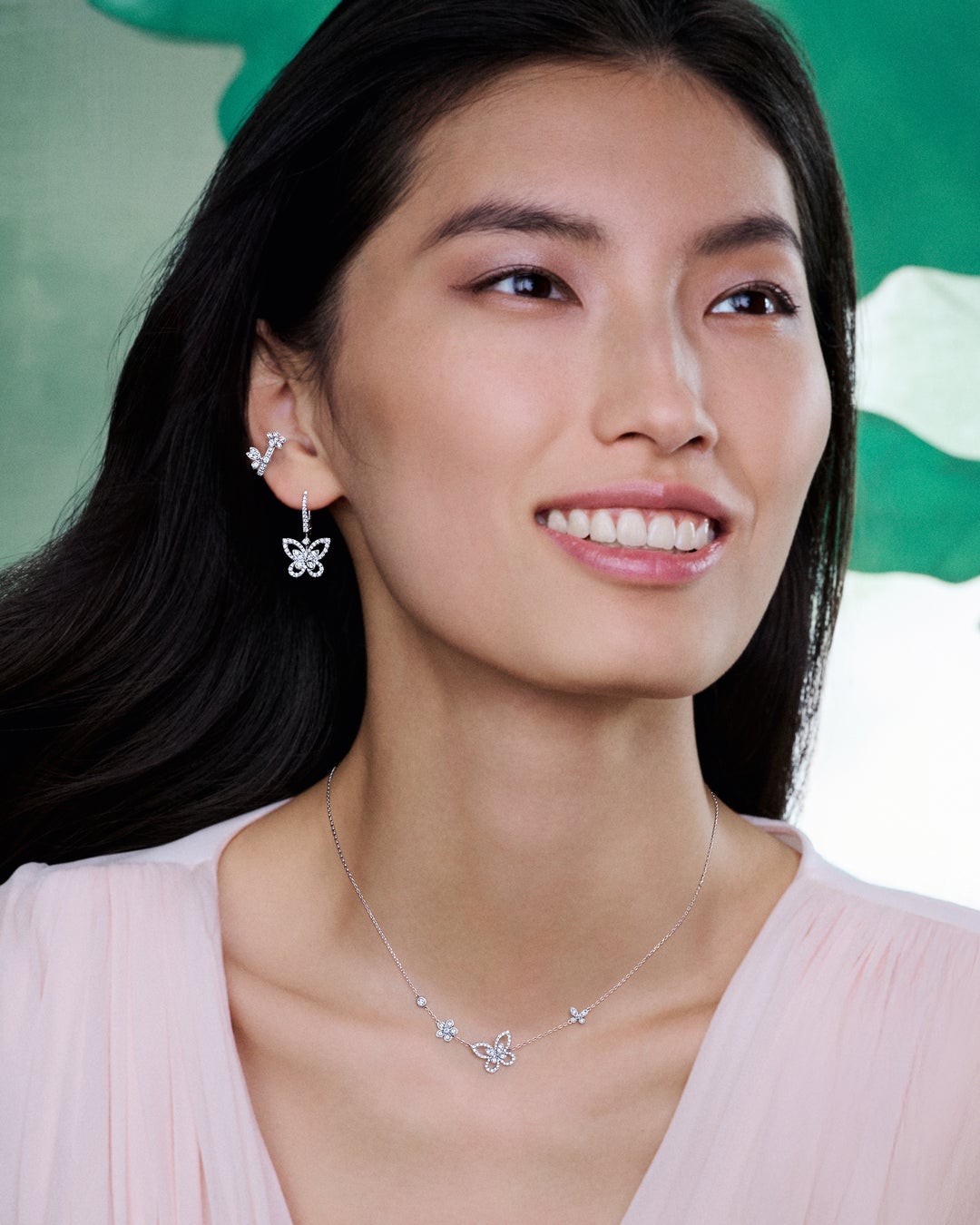 いっぽうその他のビジュアルでは、バタフライシルエットファインジュエリークリエイションにフォーカスが当てられ、そのきらめくパヴェセッティングダイヤモンドがそれぞれのモチーフの輪郭を描き、フォルムを際立たせています。美しいデザインがリズムとバランスを巧みに表現し、複数のバタフライが優美に重なる構成や、ひとつのフォルムが際立つデザインの一方で繊細なフローラルモチーフのダイヤモンドがアクセントとしてさりげなく施されているアイテムも新たに登場しています。