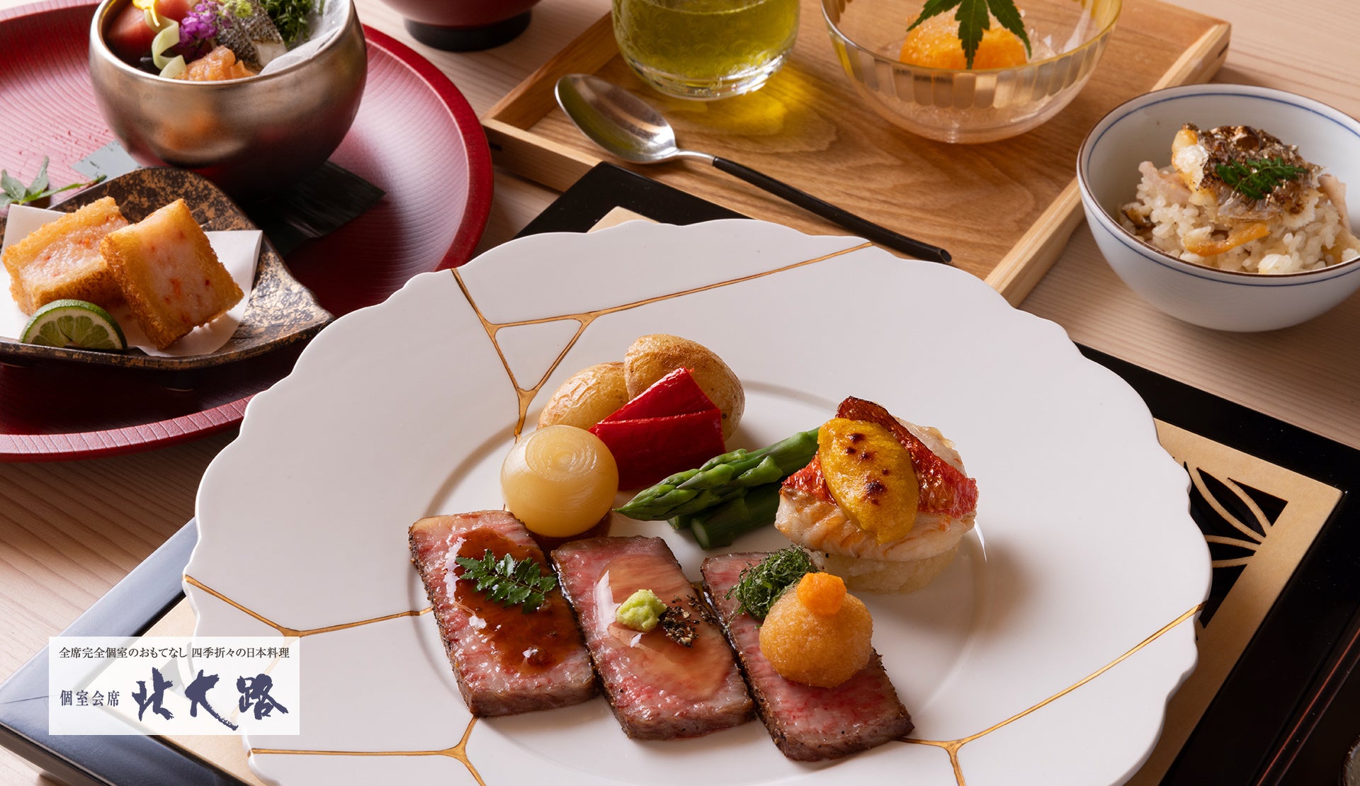 この度『個室会席 北大路』では、ビジネスだけでなくプライベートでも使えるランチメニューを増やして欲しいというお客様からのご要望にお応えし、板前のこだわりを込めた会席スタイルの新ランチコース「北大路 四季の昼会席」を開発いたしました。お料理は『個室会席 北大路』定番の黒毛和牛を使ったローストビーフを中心に、旬の食材をふんだんに使用した、目でも楽しめる華やかな献立となっております。完全個室の落ち着いた空間で、大切な方とのプライベートなひと時をお楽しみください。
