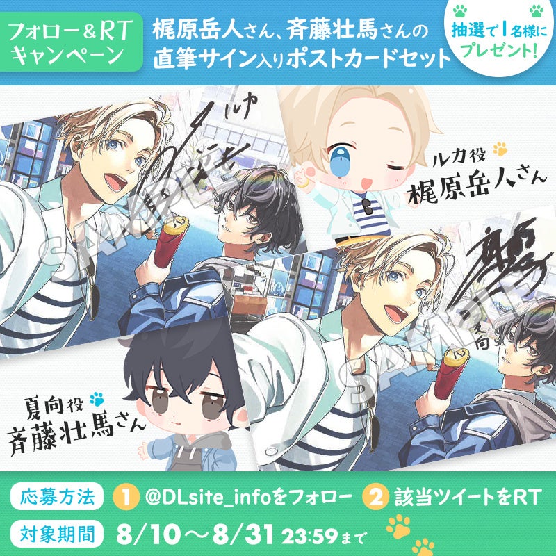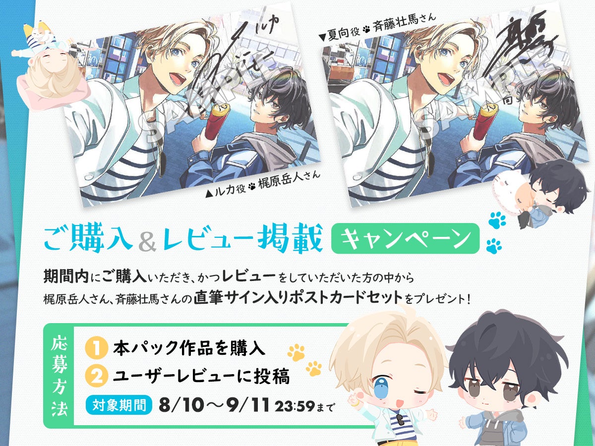 『#わんまんす』全話パックを購入し、レビュー投稿をしていただいた方の中から2名様、ツイッターでフォロー&RTしてくださった方の中から1名様に、梶原岳人さん、斉藤壮馬さんのサイン入りポストカードセットをプレゼント!