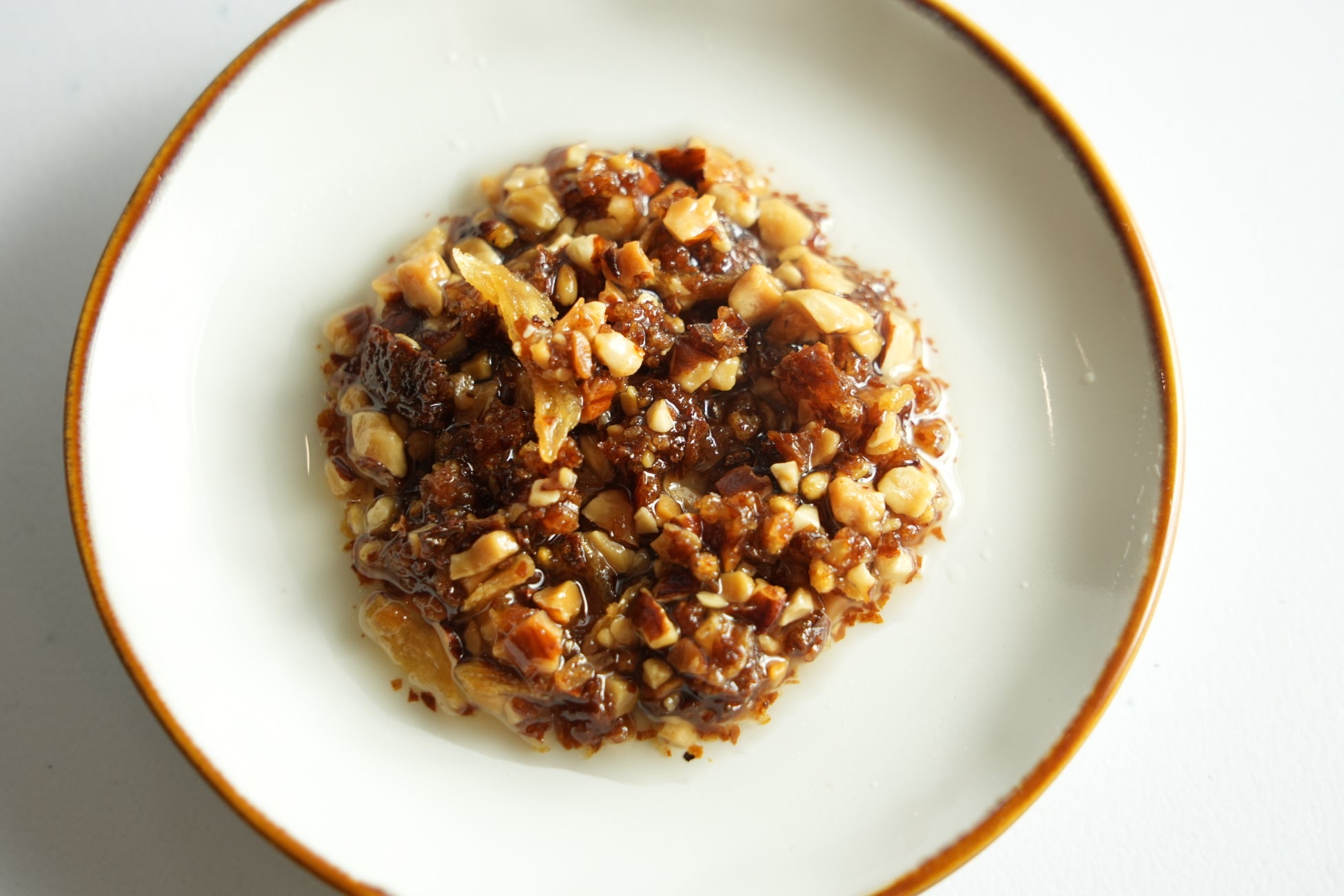 ローストアーモンドやフライドオニオン、フライドガーリックのサクサクとした食感と、もろみの入ったフリーズドライしょうゆのコクがたまらない一品です。