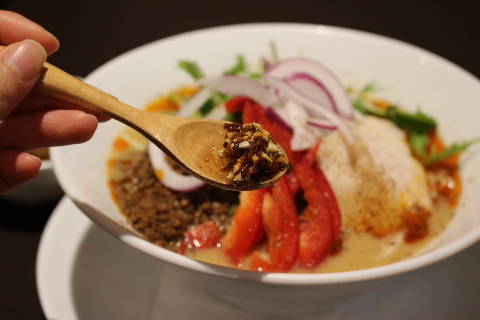コラボ第1弾では、温かいつゆ無し担担麺にサクサクしょうゆアーモンドを合わせていましたが、今回は、数種類の練りごまをブレンドして作った「冷やし担担麺」をベースに、サクサクしょうゆアーモンドを後がけのドレッシング仕立てに。