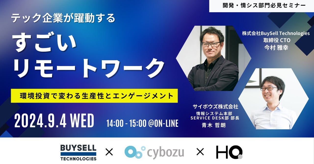 このセミナーでは、リモートワーク環境整備プラットフォーム「リモートHQ」(https://hq-hq.co.jp/remote)の導入企業であり、リモートワークとIT環境にアグレッシブな投資をされている株式会社BuySell Technologies 取締役CTO今村様、サイボウズ株式会社 情報システム本部 Service Desk部 部長 青木様をゲストに迎え、インタラクティブな質問にもおこたえしながら実践事例をご紹介します。