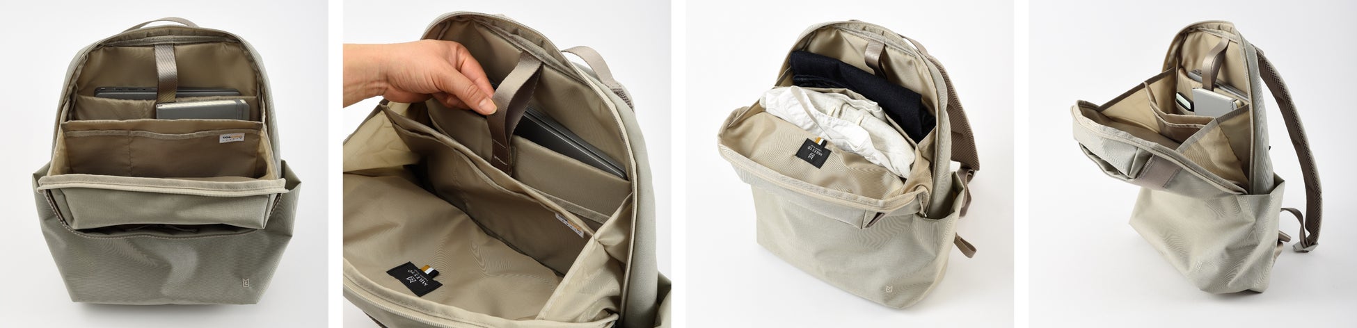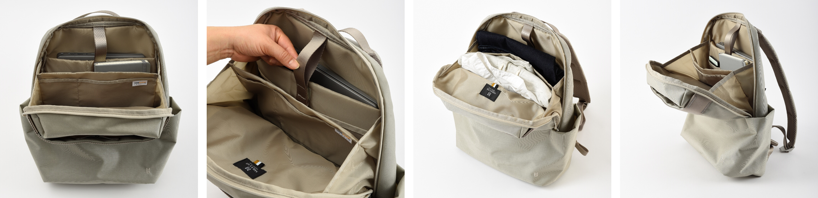 メインルームはスムーズに開閉できる蛇腹式を採用。バックパックを開いた状態でもアクセスしやすい設計のため、急いでいるときや混雑した場所、出先での作業時でもPCや書類、大きな荷物もスマートな出し入れが可能です。