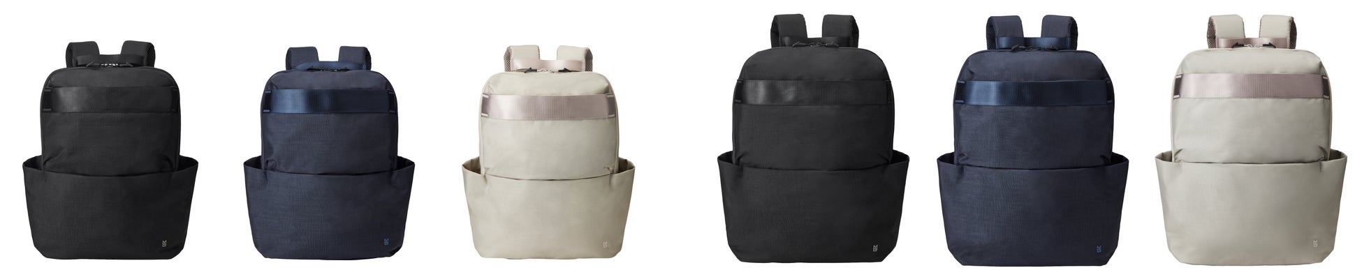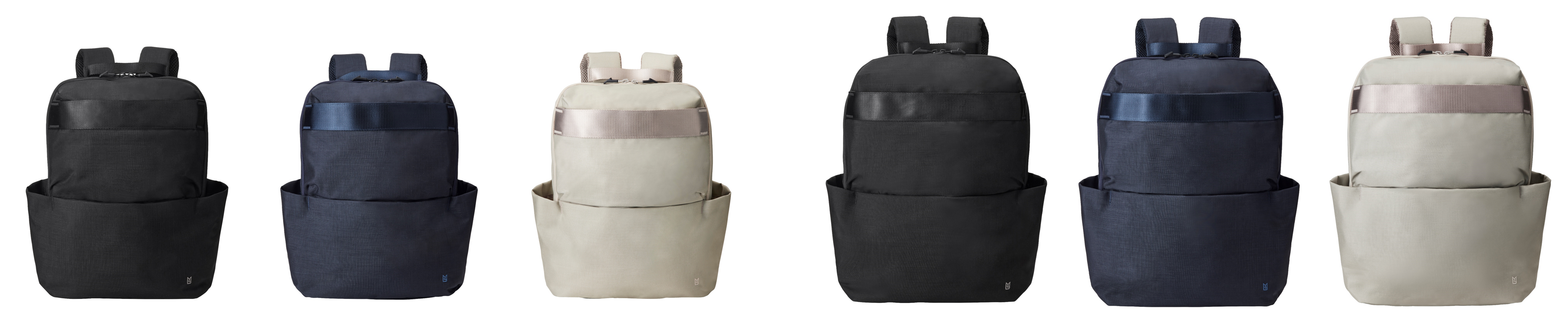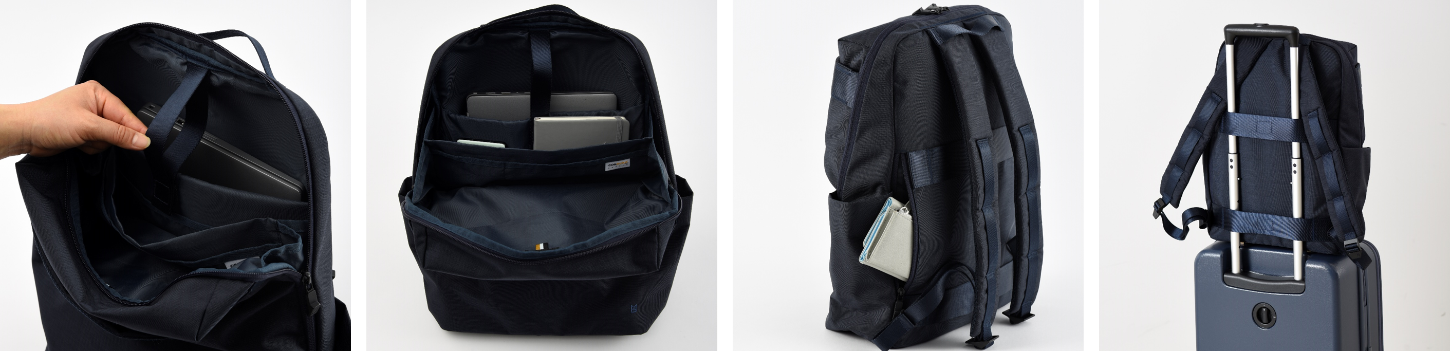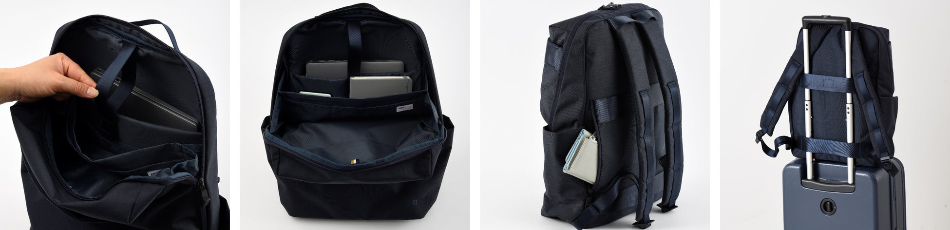 メインルームにはノートPC用のクッション付スリーブポケット(Mサイズ13インチ/Lサイズ15インチ)を配置。更に小物や文具など異なるサイズ・形状のアイテムを分類して収納できる充実の仕分けポケットを搭載。背面には貴重品などを収納できるフ ァスナーポケットを配置し、キャリーケースのハンドルに固定できるベルトも装着しているため、トラベル、ビジネスシーンにおけるさまざまなニーズに対応します。