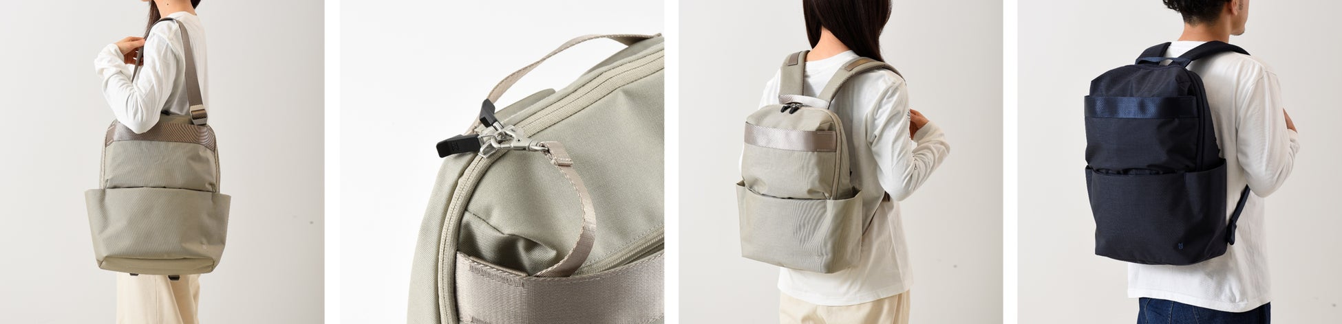 外側にショルダーベルトが装着されているため、ワンアクションでショルダー掛けもでき、電車や暑い時期でも背中の蒸れを気にすることなく快適に使用できます。簡易防犯として、簡易ファスナーロック機能も採用。バックパックでの移動時も安心です。Mサイズ(容量約 15L)とLサイズ(容量約 21L)の2サイズ展開。必要容量に合わせて最適なサイズをお選びいただけます。