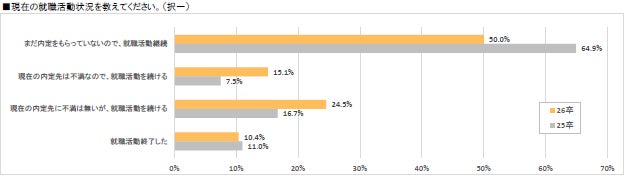 ・「まだ内定をもらっていないので、就職活動継続」が50.0%で昨対-14.9%。内定を持っているが継続、は昨対大幅増、就職活動終了は10.4%で昨対-0.6%。