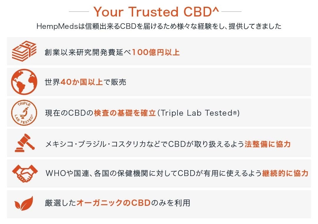 私たちは製品の品質に徹底的にこだわり、用途に合わせた幅広い選択肢をリーズナブルな価格で提供しています。信頼性と先駆性を兼ね備えたHempMedsのCBD製品は、健康やウェルビーイングに貢献することをミッションとしています。