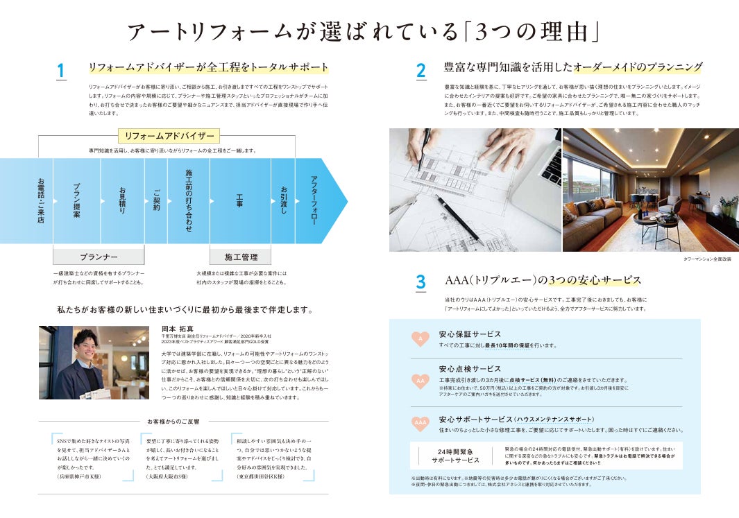 アートリフォーム、企業ブランドの浸透に向けて会社案内パンフレットを10年ぶりにリニューアル。顧客期待値の高度化に合わせ、会社紹介の品質向上と平準化を狙う。