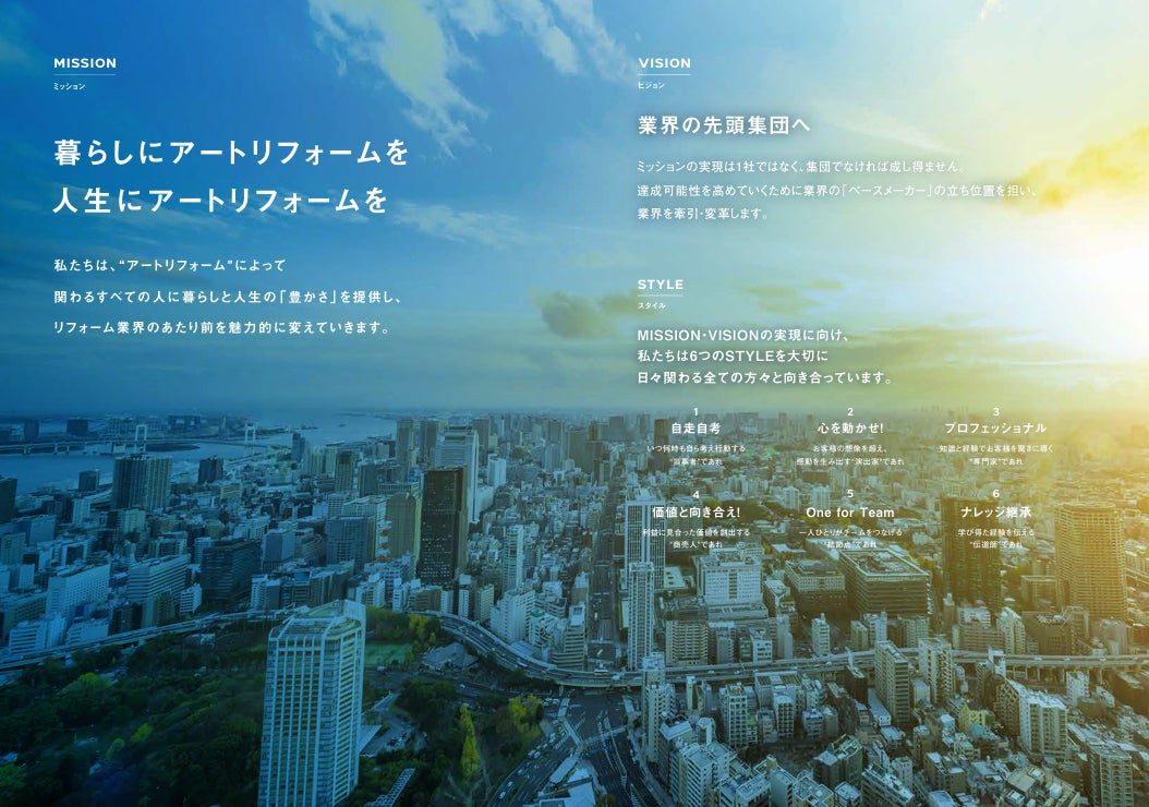 当社は、「暮らしにアートリフォームを 人生にアートリフォームを」というミッションのもと創業から70年間、住宅のリフォームやリノベーションによって、豊かな暮らしと人生を提供しております。新規事業の立ち上げや、対応エリアの拡大によって、より多くのお客様に『暮らしの質の向上』の手段として、リフォームの価値を広く伝え、ミッションを実現します。この度の会社案内パンフレットリニューアルによって、企業ブランドの理解浸透を促し、ミッション実現に向けて邁進してまいります。