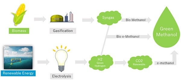 メタノール燃料は、従来の舶用燃料を燃焼した場合に比べ、燃焼時の硫黄酸化物(SOx)排出量を最大99%、粒子状物質(PM)排出量を最大95%、窒素酸化物(NOx)排出量を最大80%、二酸化炭素(CO2)排出量を最大15%削減することができます。既に実用化されており、世界で主要な130港程度で供給・補油が可能です。多様な排出源から回収したCO2と再生可能エネルギーを利用して製造された水素を合成し生産されたeメタノールや、バイオガス由来のバイオメタノールなど、非化石原料由来のメタノールを活用すれば、排出されるネットGHG排出量の更なる削減につなげて行くことも可能です。