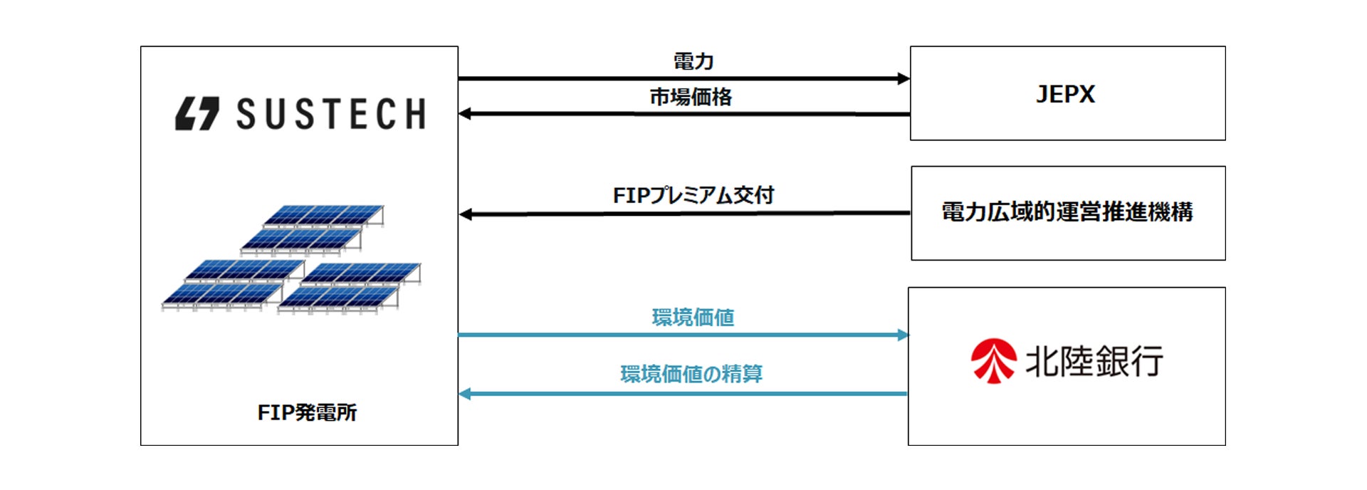 本取り組みは、Sustechが開発・運営するFIP発電所で創出する再エネの環境価値だけを北陸銀行が取得する仕組みであり、地方銀行として初めての取り組みとなります。