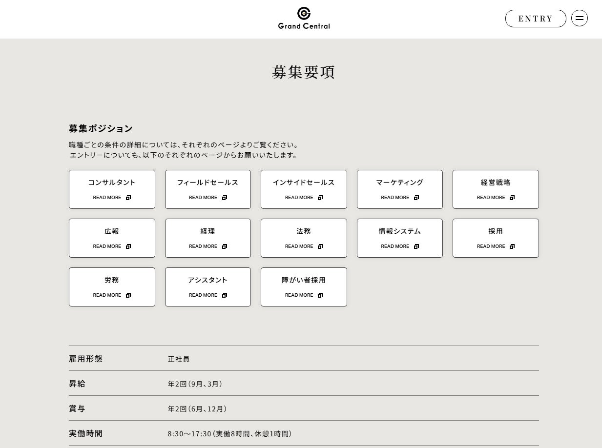 今までのGrand Centralの強くてスタイリッシュなイメージから、採用サイトは白やグレーを基調とした柔らかいイメージに変更しており、多くの求職者様に親しみやすいデザインとなっております。