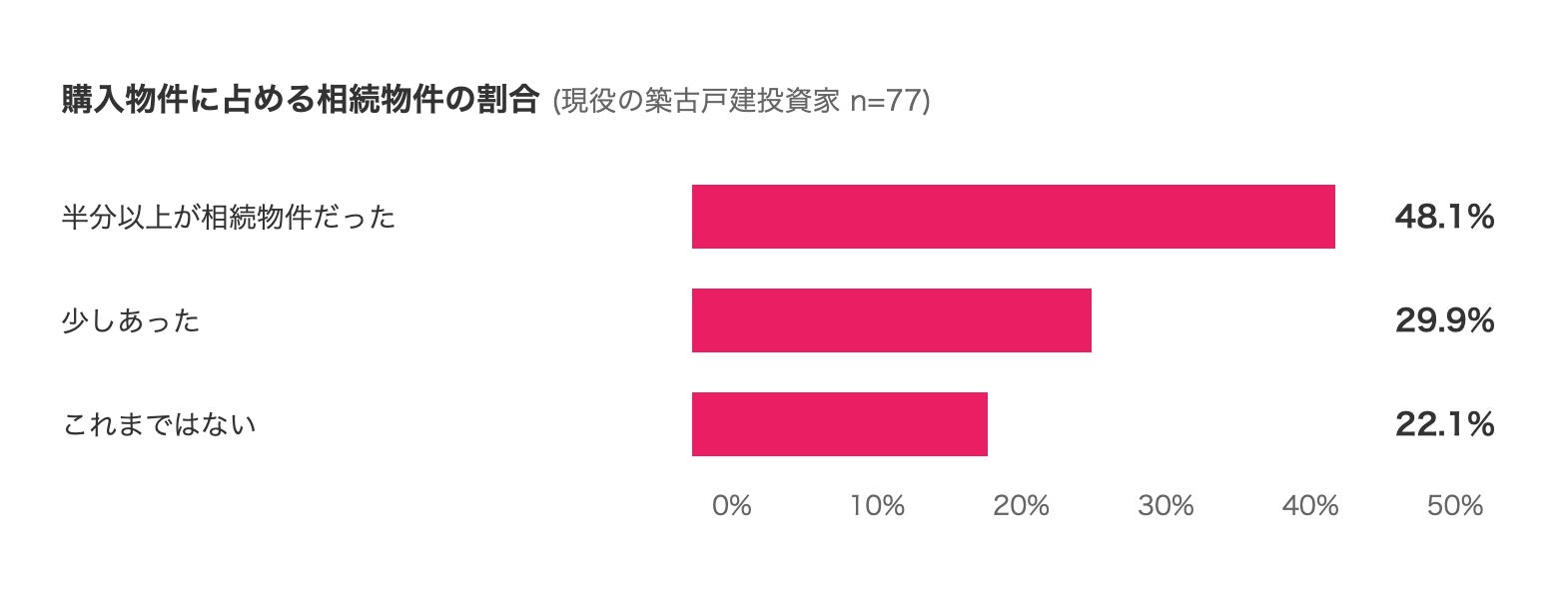 現役の築古戸建投資家(n=77)の48.1%は、これまで購入した築古戸建のうち「半分以上が相続絡みの物件」だと回答。相続登記未了、相続人多数などの事情が絡む物件が投資家の仕入れ対象になっている実態が確認されました。