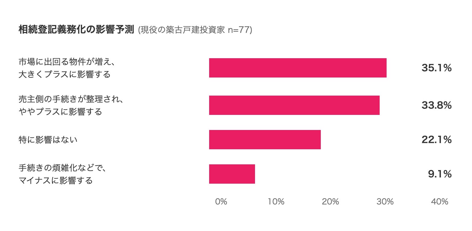 相続登記の義務化をはじめとする制度改正は、多くの投資家にとって"市場への追い風"と捉えられており、権利関係の整理が進むことで、検討可能な物件が増えることへの期待がうかがえます。