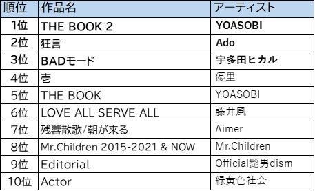 2019年のデビュー・シングル「夜に駆ける」でオリコンなど、各音楽チャートで1位を獲得して以降、J-POPシーンの最前線を駆け抜ける音楽ユニットです。2021年にリリースした本作では、人気アニメの主題歌を務めた「怪物」「優しい彗星」、CMソングにも起用された「大正浪漫」をはじめ全8曲を収録。DISCASにおいても、その音楽性が世代を問わず幅広く支持され、見事1位となりました。