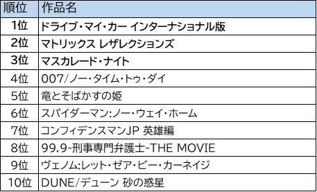 2位の『マトリックス レザレクションズ』(主演 キアヌ・リーブス/キャリー=アン・モス)は、キアヌ・リーブスの代表作にして、世界的に社会現象を巻き起こした傑作SFアクション「マトリックス」シリーズの第4作目です。今もなお語り継がれるSFアクション映画の金字塔として、シリーズ前作から18年ぶりとなる続編にはファンのみならず多くの方から注目を集めました。