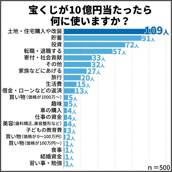 最も多い割合を占めているのは、1億円当選時と変わらず「土地・住宅購入や改装」でした。その後に続く「貯蓄」や「投資」、「転職・退職する」も割合的に大差はありませんね。